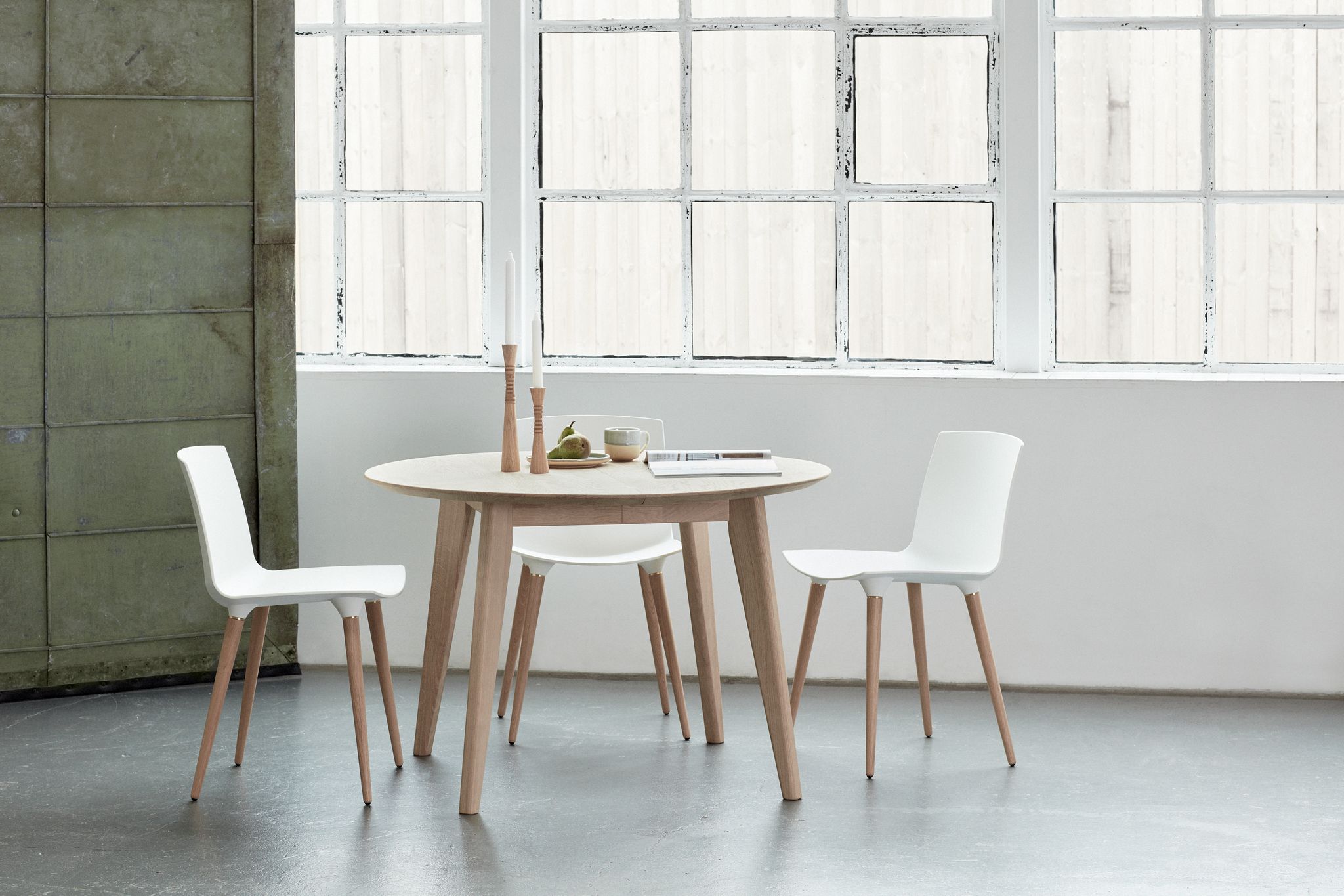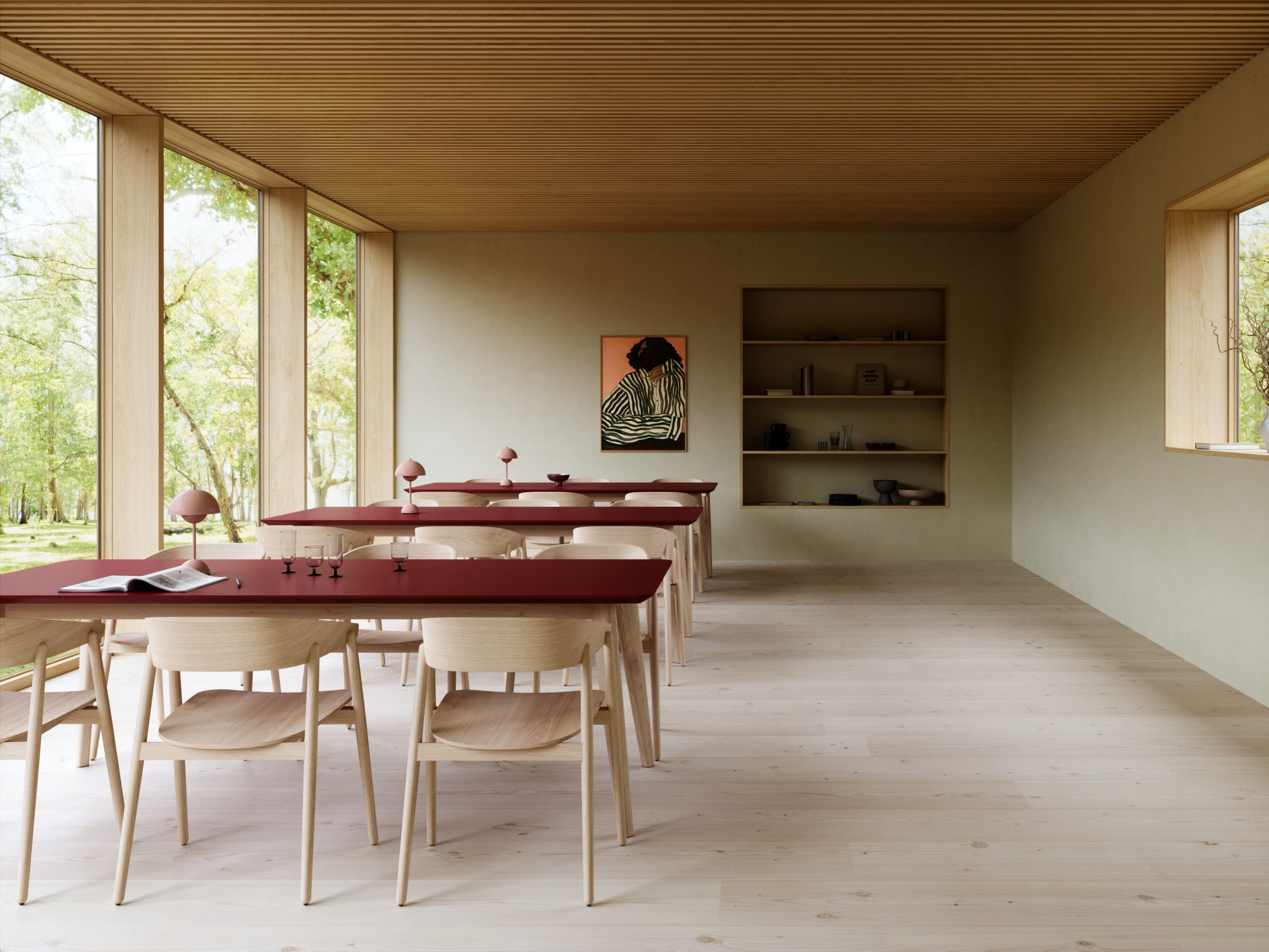 Den klassiska ramen i massiv ek ger bordet en lätt och naturligt varm karaktär. Bordsskivan finns tillgänglig med laminat eller linoleum i ett stort urval av färger, vilket gör bordet lämpligt för mötesrum och matsalar.