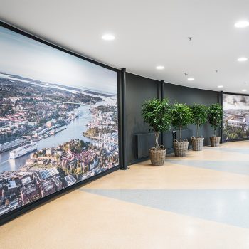 Eftersom materialvalen samspelar skapas både funktion och estetik. Dessutom ger kombinationen av glas, tyg och naturmaterial ett varmt och professionellt intryck.