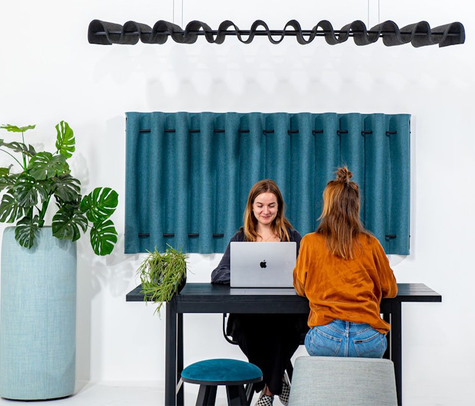 Den akustiska panelen hängs upp horisontellt eller vertikalt i taket. Välj horisontell för en klassisk ljudbaffel, eller vertikal för att skapa både ljudabsorption och visuell avskildhet mellan arbetsytor.