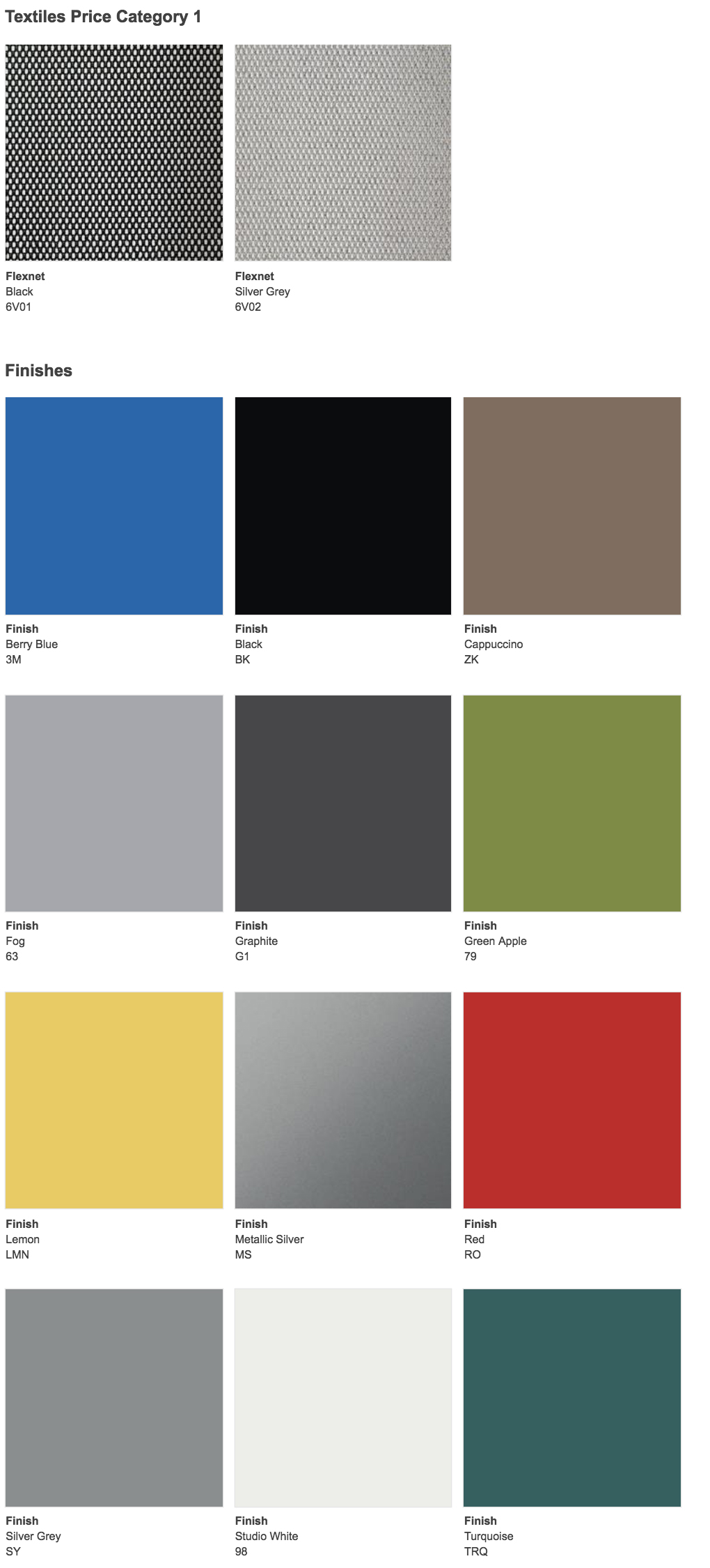 | Sits och rygg | Black, Graphite, Studio white, Berry blue, Cappuccino, Fog, Green apple, Lemon, Red, Turquoise |