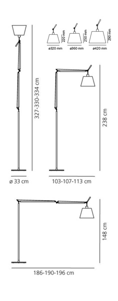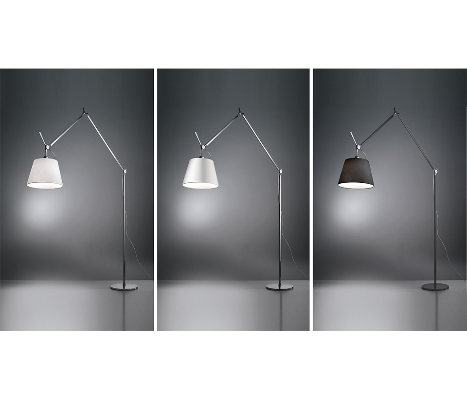Golvlampa Tolomeo Mega Floor har lampfot och armar i polerat aluminium; skärm i svart siden, pergamentpapper (något gulare – endast offert) eller i silkesatin (mera vit) på en plastram; leder i polerat aluminium.