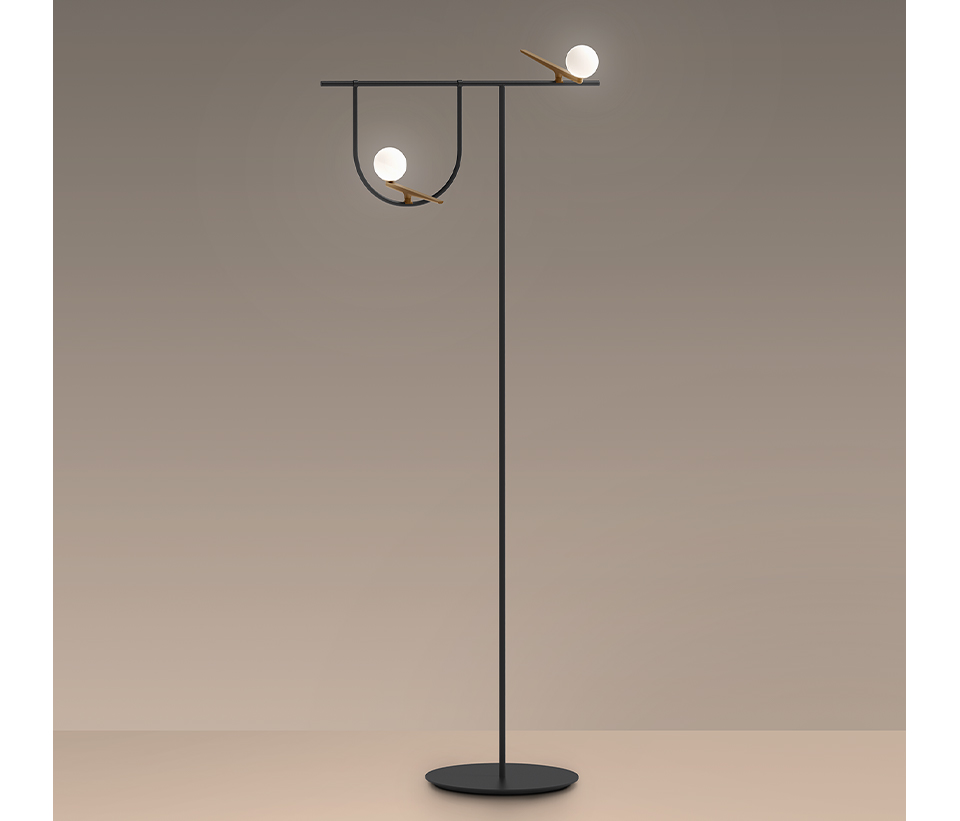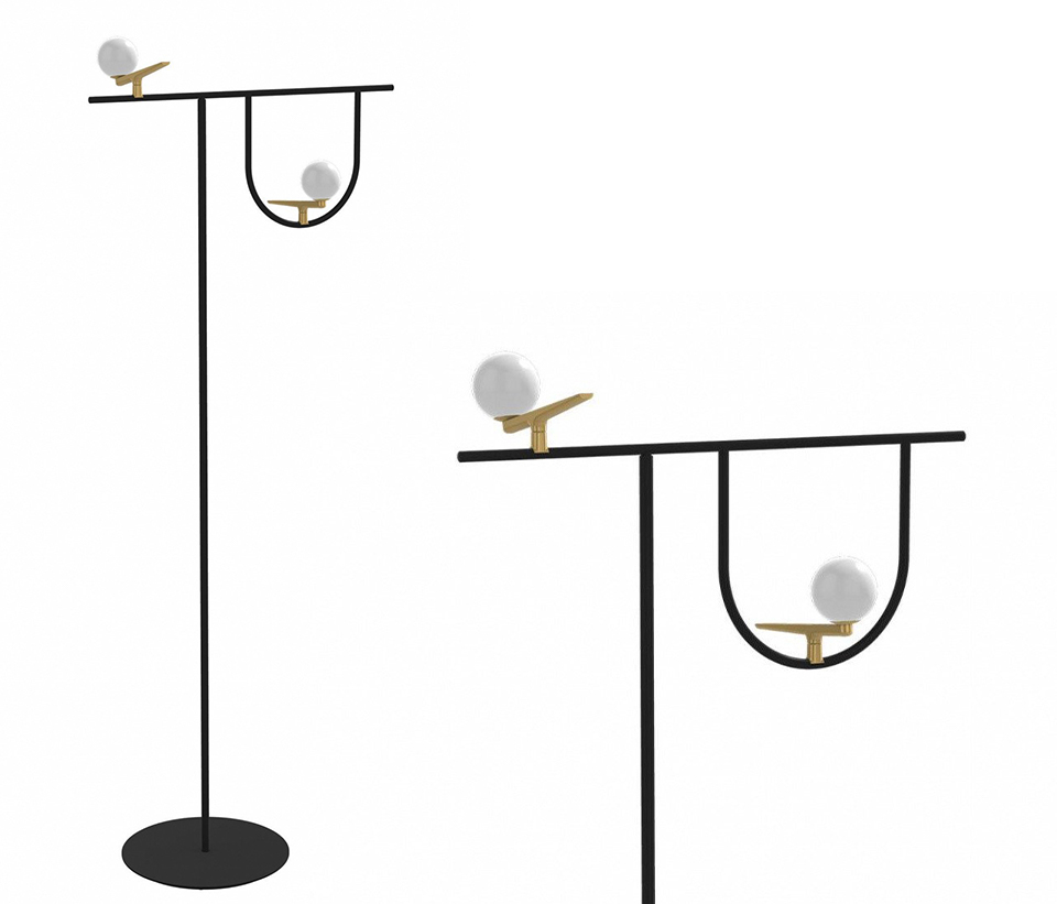 Yanzi golvlampa har varma och kalla material och ljuset är illusion av en fågel på pinne