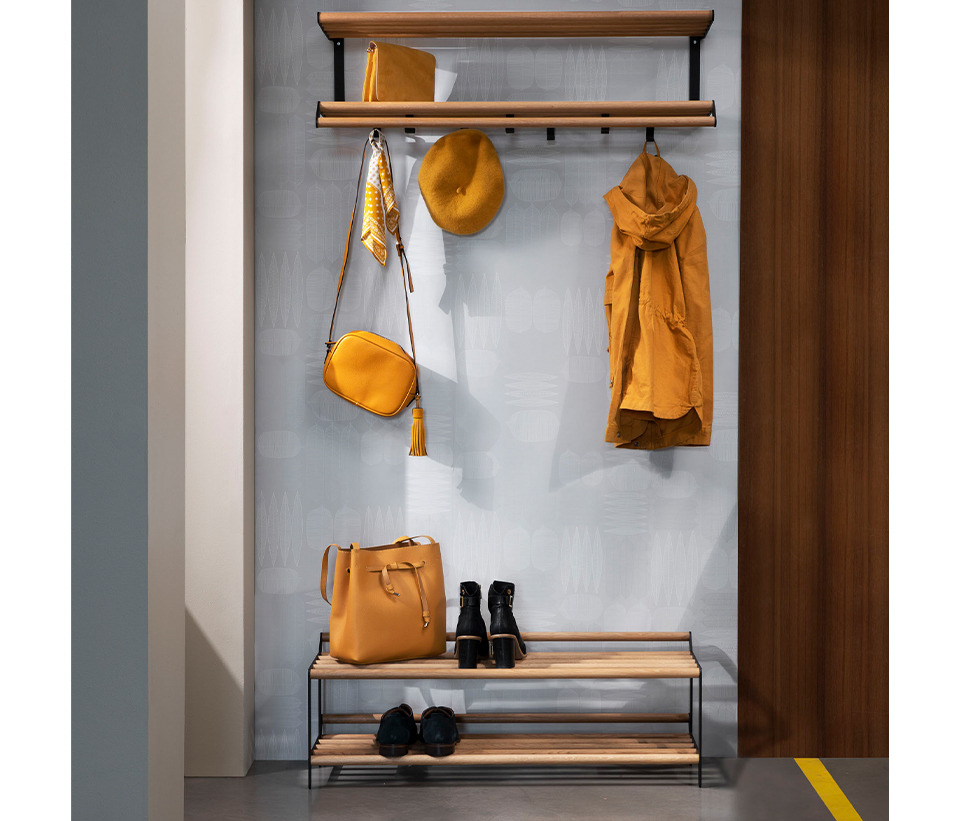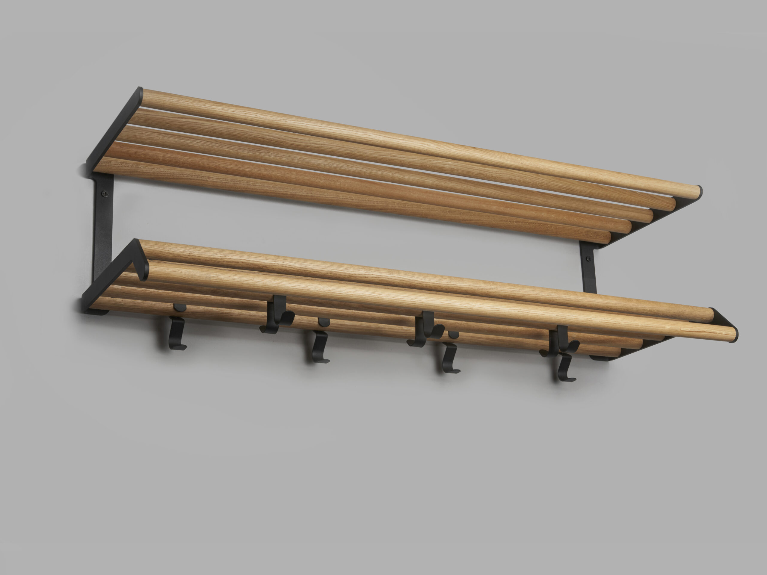 Den robusta Tamburin hatthylla är konstruerad för att möta de krav som det skandinaviska klimatet ställer, med stålgavlar i pulverlack och hållbara ekrundstavar i klarlack.