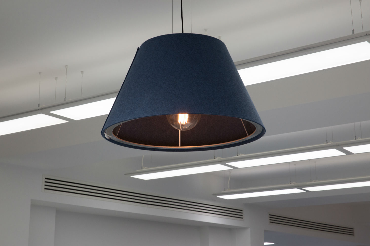 BuzziShade består av en lampskärm täckt i ett lager av ekologisk tyg som har både ljudreducerande och ljudabsorberande egenskaper. Passar perfekt i kontorsmiljöer men också större öppna ytor där ljudet behöver dämpas.