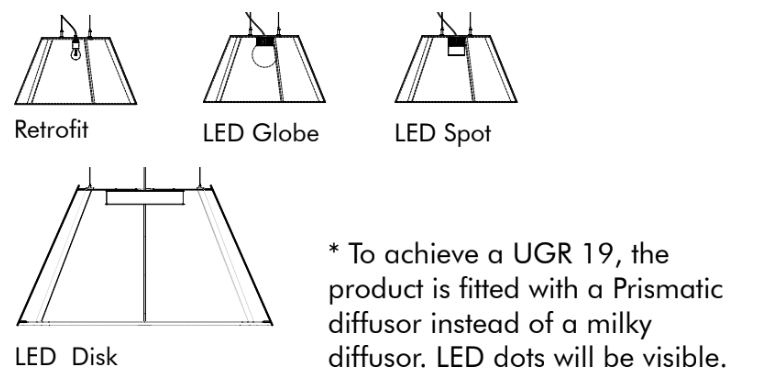 Lampan går att variera och finns i två modeller, som taklampa och som golvlampa. Dessutom kan man välja mellan två olika storlekar på taklampan, M eller L.