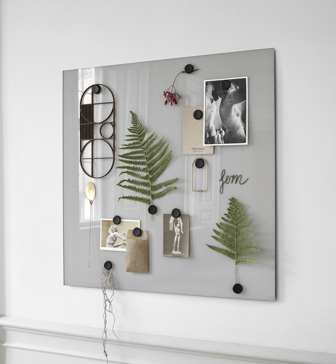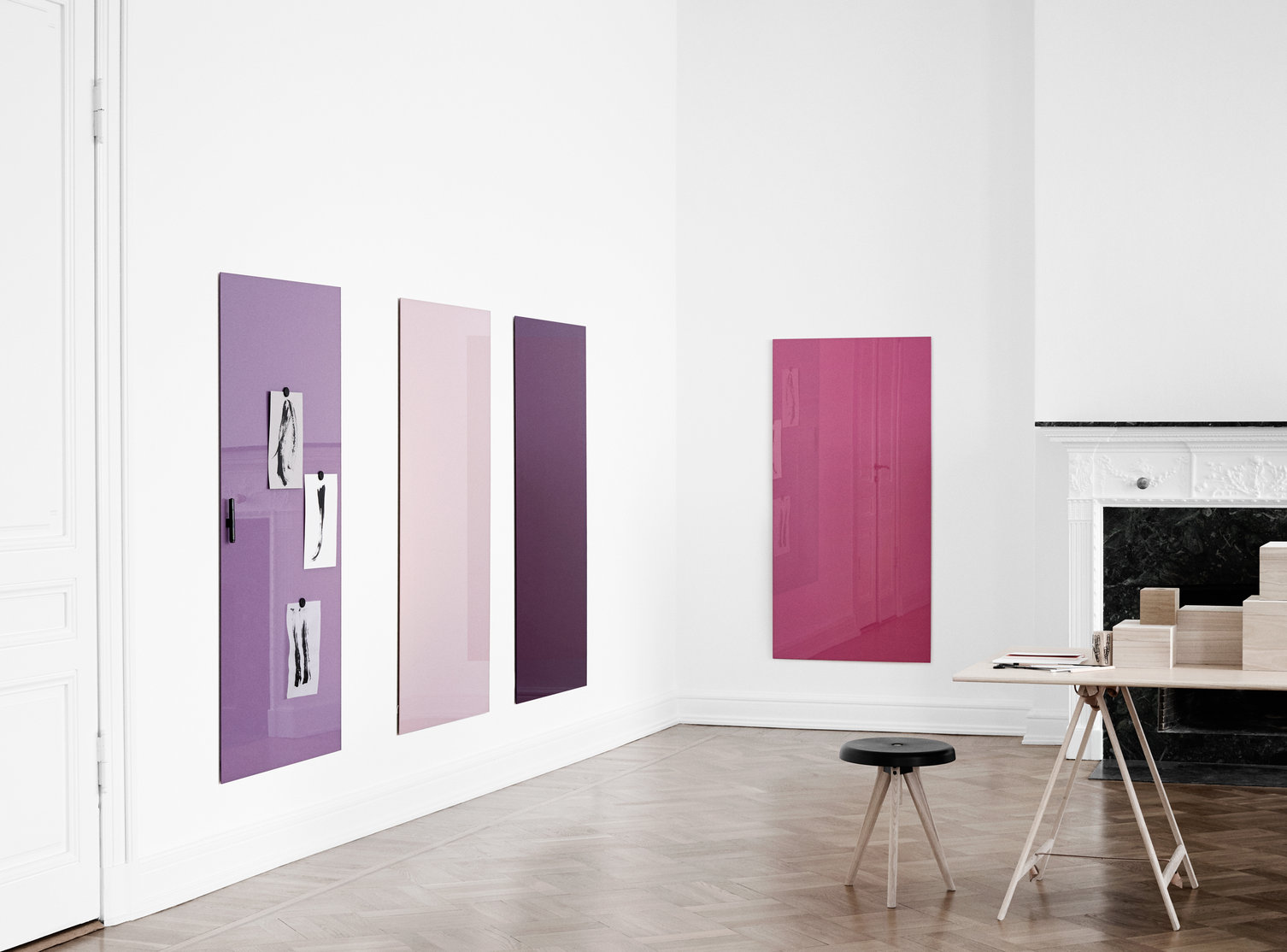 Mood Wall är en minimalistisk, stilren och magnetbärande skrivtavla i glas, som finns i 24 olika färger. Den svävande känslan förstärks genom de dolda beslagen och avsaknaden av ram.