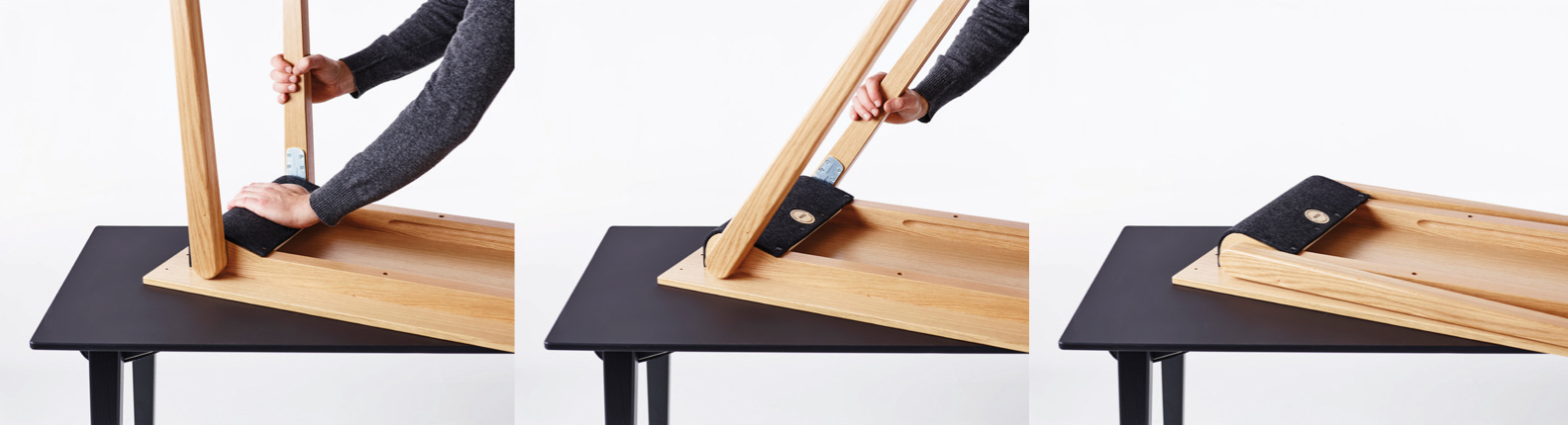 Du fäller upp bordet enkelt genom att låsa benens låsmekanism och bär även det med ett dolt grepp i undersidan av bordsskivan . När bordet ska förvaras staplar du det – med ett säkerhetsöverdrag i filt som skyddar ytan .