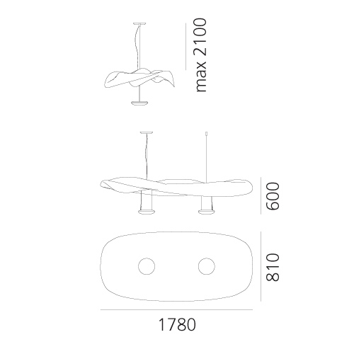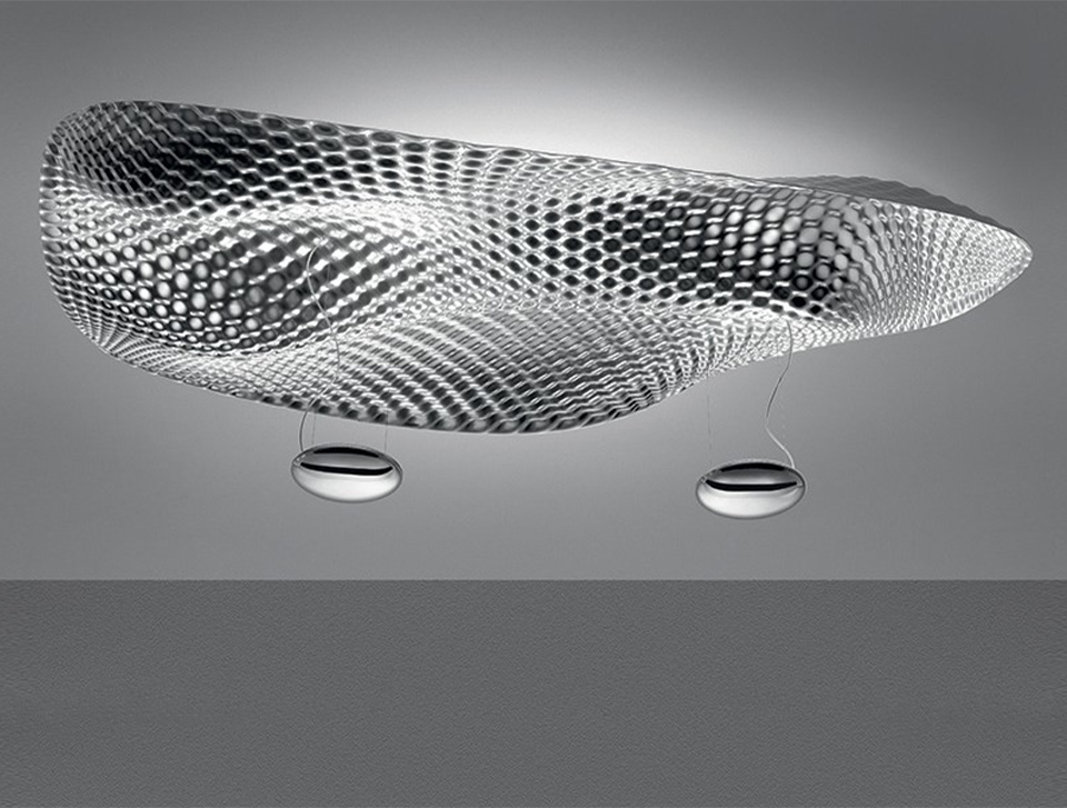 Taklampa Cosmic Angel designades för Artemide år 2009 av Ross Lovegrove och hans ambition var att återskapa och frysa ett ögonblick där luft och tyngdkraft spelar sin roll och skapar ett skulpturalt flöde.