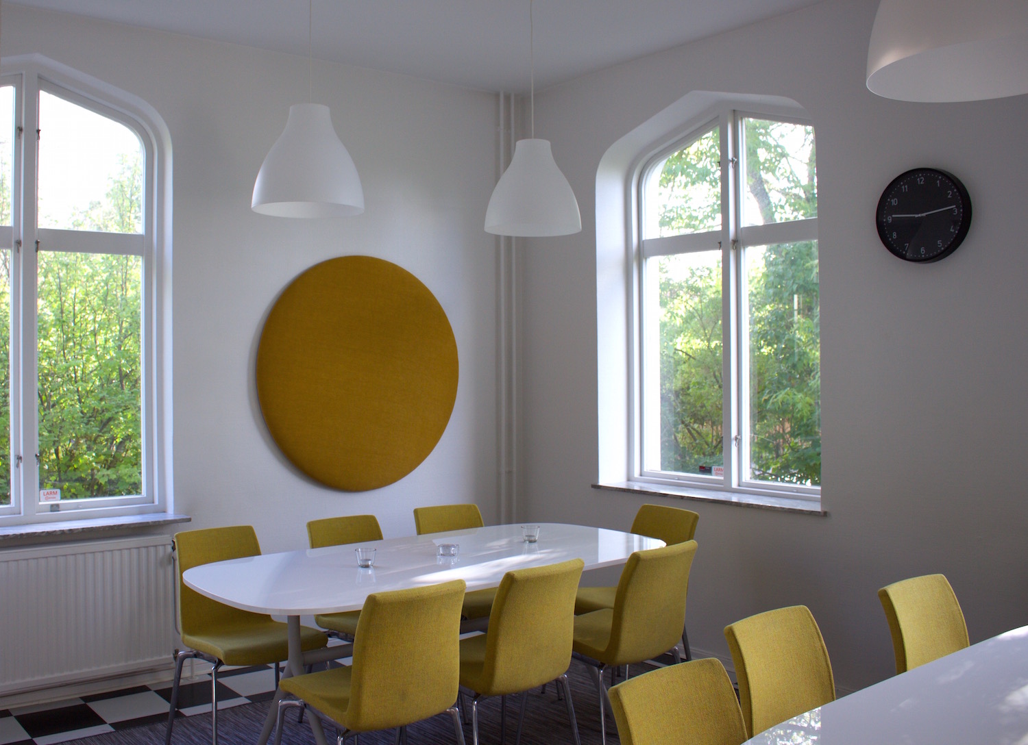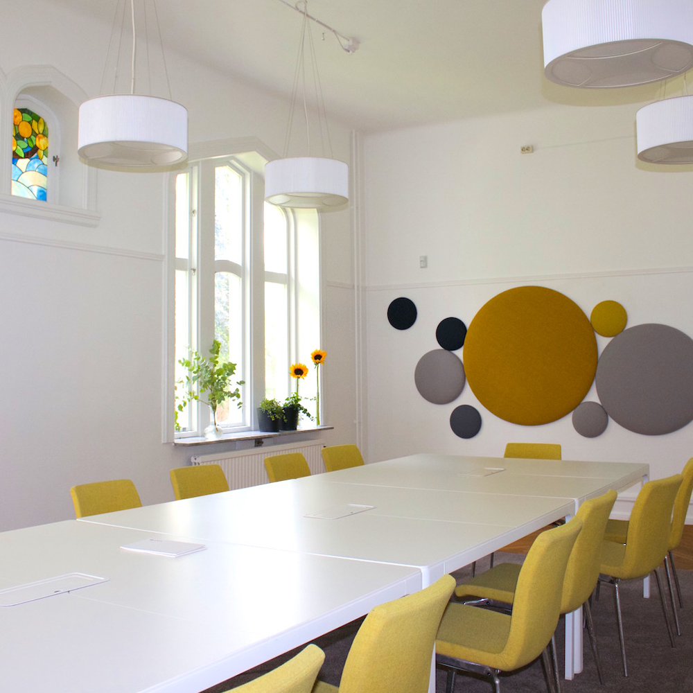 Det finns flera vackra tyger som har olika uttryck och som kan kombineras ihop. Väggabsorbenterna Woolbubbles® finns i många grundformer som kan kombineras.