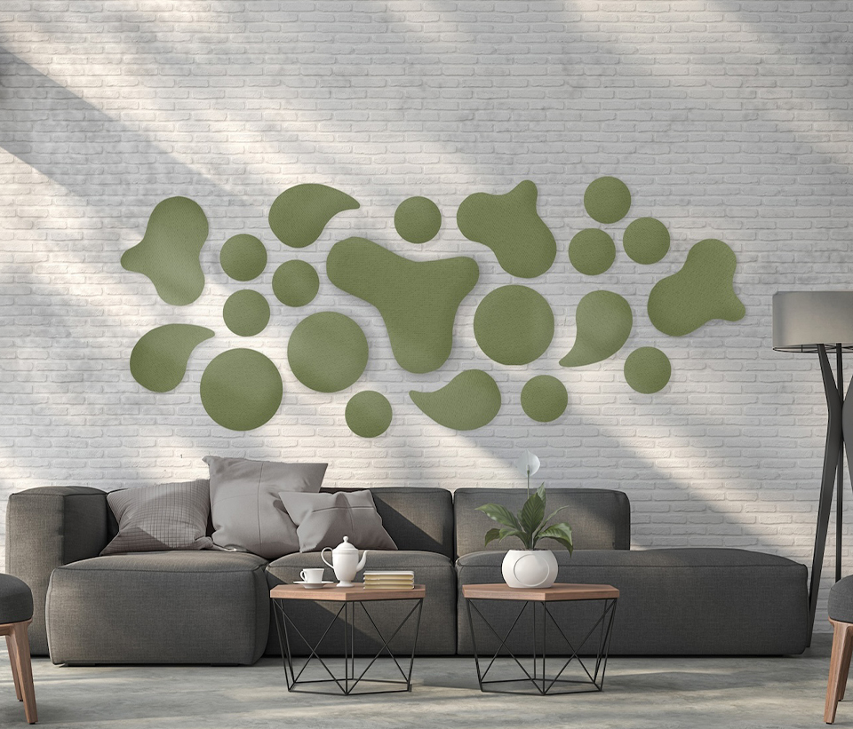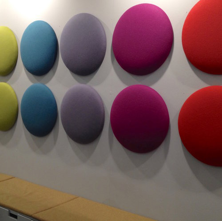Woolbubbles Väggabsorbent är med sina eleganta rundande former unika på marknaden. Klädda i exklusivt ulltyg tillgängligt i flera färger, är de vackra och taktila.